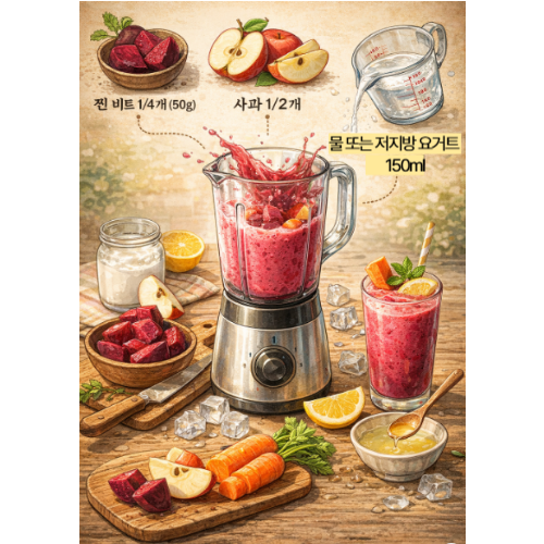 비트 단독보다는 사과, 당근과 함께 1:1:1 비율(ABC 주스 변형)로 갈아 마실 때 흡수율과 맛이 극대화됩니다.
